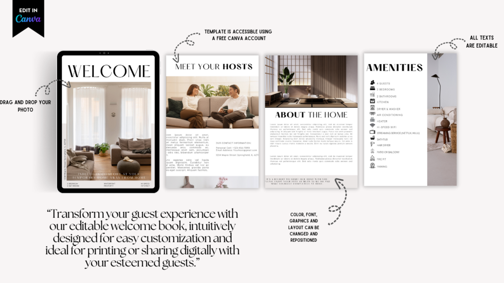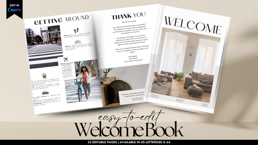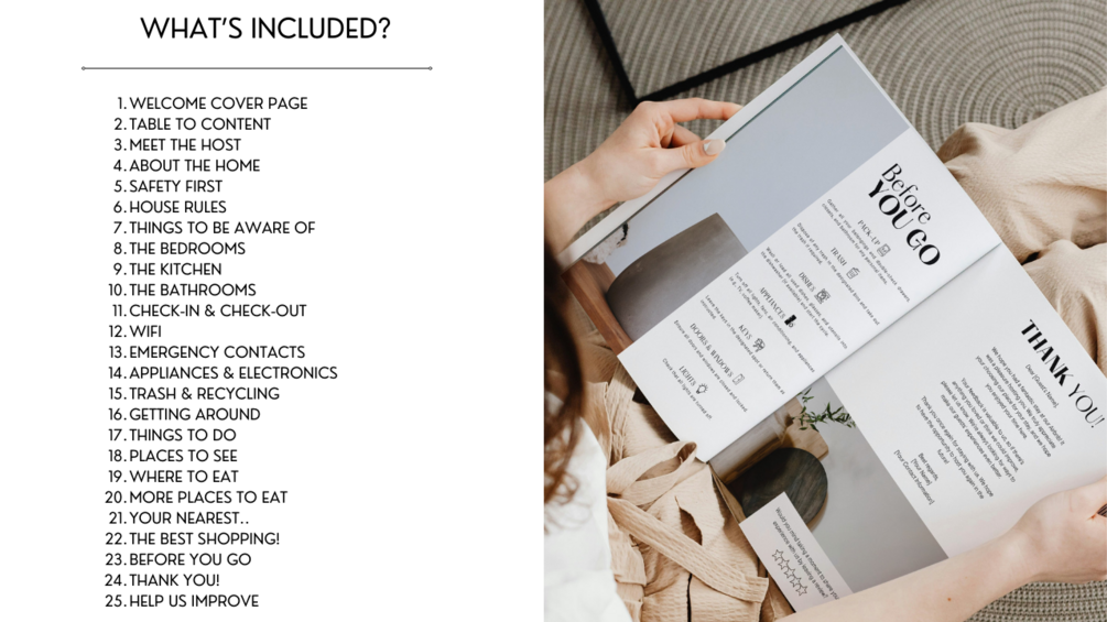 Don't settle for a generic welcome book. Elevate your Airbnb hosting experience with our customizable Canva template and leave a lasting impression on your guests! Get started today and set the stage for unforgettable stays.